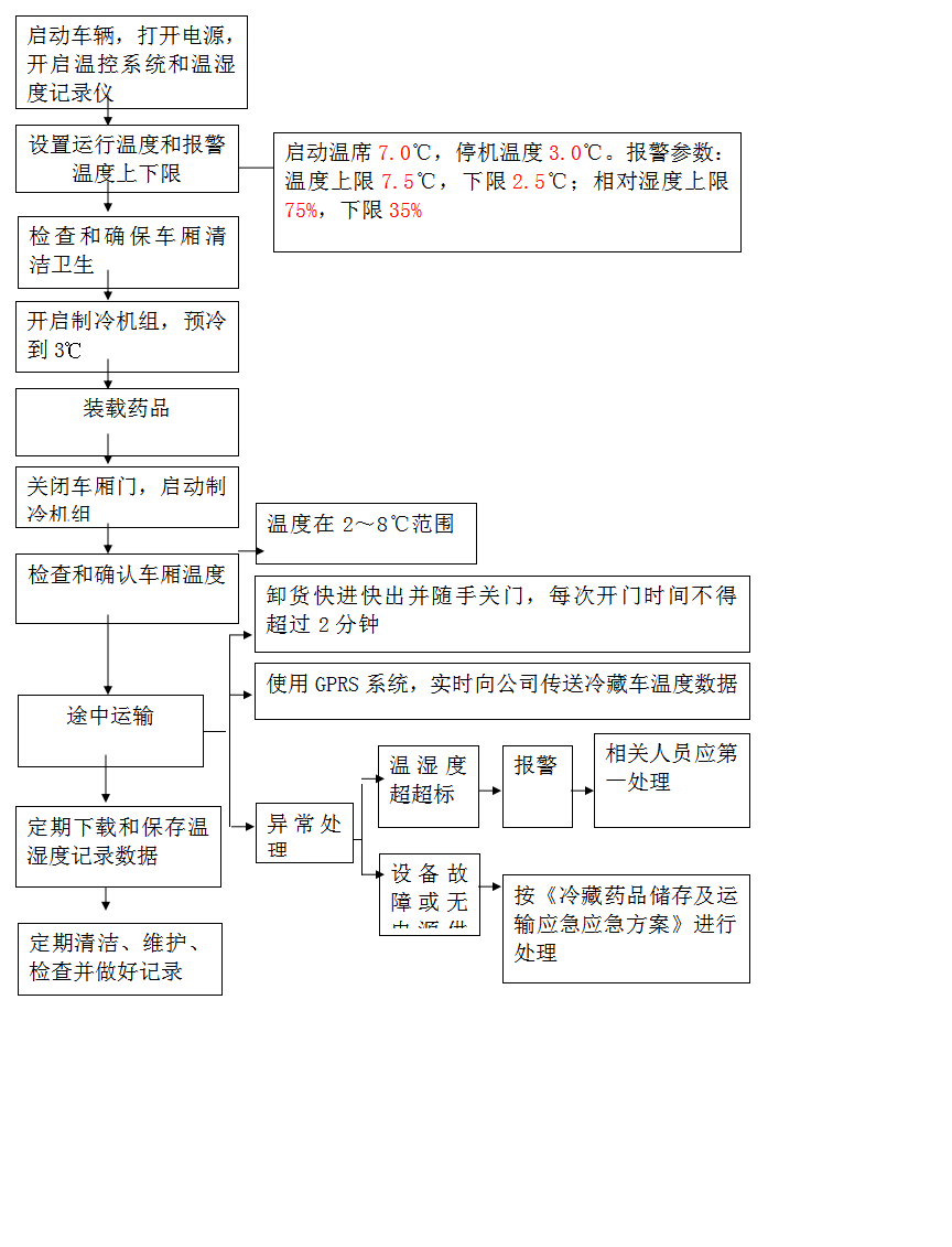 5.2.7出車前檢查:檢查內(nèi)外風(fēng)機(jī)運(yùn)轉(zhuǎn)是否正常,制冷是否正常。檢查門封是否嚴(yán)密,車廂是否保溫。檢查溫濕度記錄儀是否正常記錄。當(dāng)溫度達(dá)到2-8℃范圍時(shí),檢查合格后,放行出車。